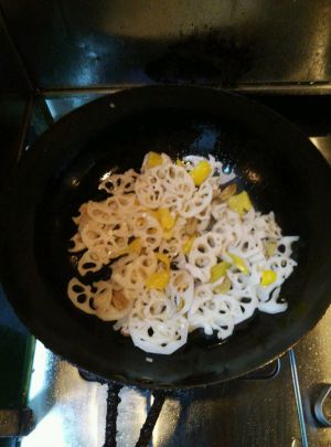 热锅凉油煸姜丝跟部分蒜片,放藕片、菜椒;