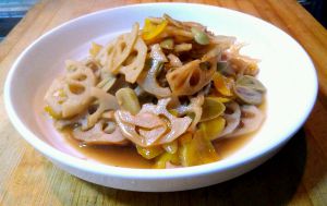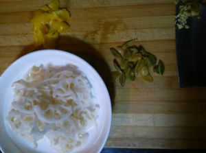 鲜藕去皮切片泡水去淀粉,菜椒、腊八蒜切片,姜切丝备用;