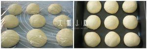 盖上保鲜膜醒发15分钟;醒发完毕后分别排气,后滚圆排在烤盘上。