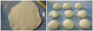 在硅胶垫上用擀面杖把面团擀薄,排气;收圆,称一下重量,分成9份;分别滚圆。