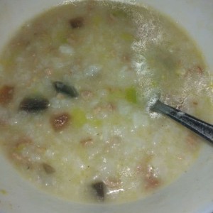 拿小锅到开水,放一碗剩米饭进去,开大火煮,煮沸之后把刚才炒好的皮蛋瘦肉放进去煮,同时加入盐,味精,花椒,香葱,煮沸,就可以开饭了,