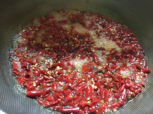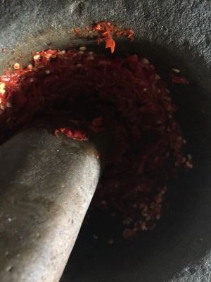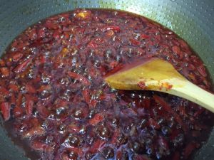 把煮好的辣椒杵烂,这就是传说中的糍粑辣椒,火锅底料颜色好就靠它了