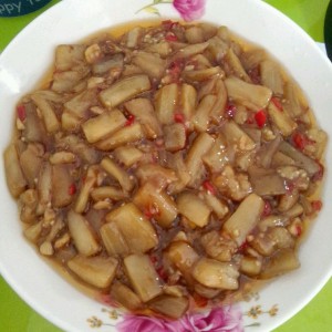 油多些,辣椒蒜先放锅爆炒,再把茄子捞起来,放锅里爆炒,等快熟了拿碗放点地瓜粉倒点水和生抽进里伴下,倒锅里和茄子翻炒下盐就可以出锅啦