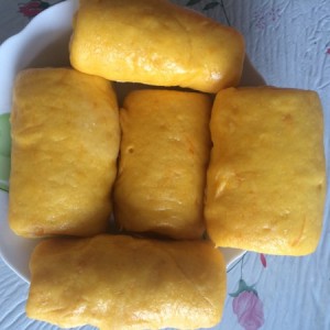 另外150g面粉放入80g南瓜泥,1g酵母,35g牛奶,5g炼乳。揉成光滑的面团。