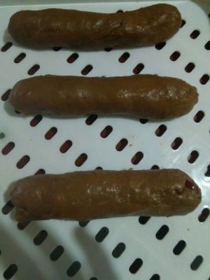 把饼泥戳成条。放进微波炉里面考个6分钟时间过半的时候反面继续考。