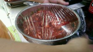 包上保鲜膜,放进冰箱冷藏两天。中间要给猪肉翻身