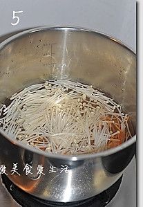 步骤3的锅中,倒入金针菇和胡萝卜丝,焯水,一分钟左右,捞出。