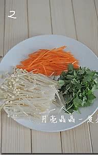 金针菇切去根部、洗净沥干,胡萝卜去皮切成细丝,香菜洗净切小段。