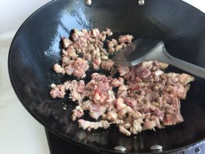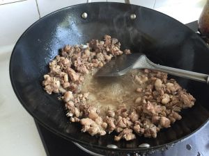 水份快炒干时,放盐适量,加料酒,继续炒动,直到鸭子水份炒干,逼出油。