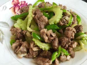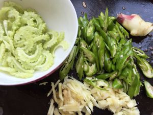 把鸭肉装出,多余的油留锅内,如余油不够炒剩下的作料就要加适量油。把青椒、苦瓜、仔姜,蒜倒入锅中炒。