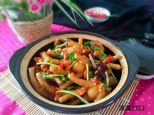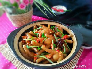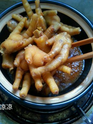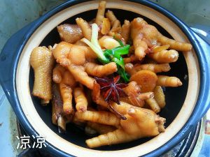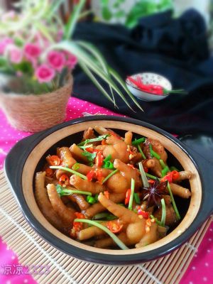 砂锅煮的过程中用筷子将鸡爪翻均匀,让鸡爪充分入味。砂锅煮肉菜容易传热,煮出的肉菜比较鲜。慢火煮至汁快干关火即成干锅。