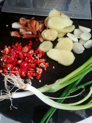 备好姜葱蒜辣椒,葱备些红葱头,青葱用来打葱结。