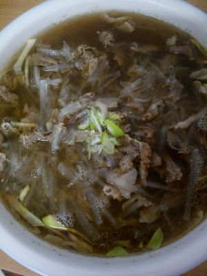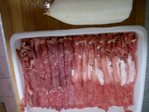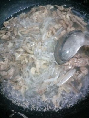 萝卜丝煮沸后,放入羊肉片,待羊肉片成熟,倒入大盆里即可。一定要边煮边撇沫,沫中多是嘌呤和膻味儿,一定要去掉,这样也能保证汤清。