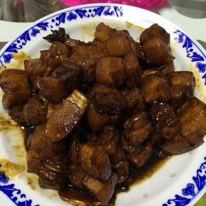 捞出煸好的五花肉,留底油放入葱段、辣椒、姜片爆香,然后倒入五花肉翻炒,倒入老抽翻炒(少量加,倒多了颜色就深了,一点一点的加,看着颜色不够再加,避免一次倒多),多炒一会儿。