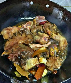 鸡下锅,大火翻炒,放入适量盐,炒热后转中火继续翻炒15-20分钟。然后放入少量水闷炒,将肉闷熟。