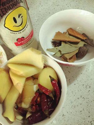 准备佐料,大蒜、生姜、辣椒洗净,生姜切片;桂皮、花椒、香页、八角准备;大葱切截备用。
