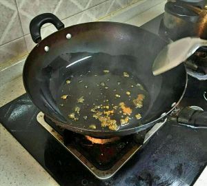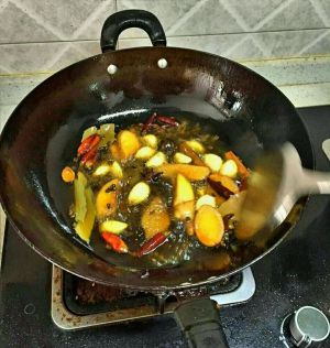 放入生姜、大蒜、辣椒、花椒、八角、桂皮、香页,中火炒香。