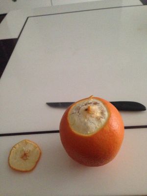 取新鲜橙子两个,放置的是带蒂的朝上,要从底部剥开,才能完全剥成橙碗,如果从带蒂的一头剥,底部就会剥漏了