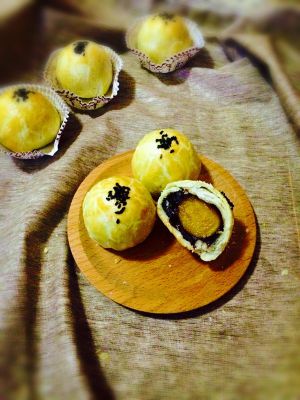 成品,香味四溢,酥皮酥得掉渣,蛋黄沙沙的还冒着油。
