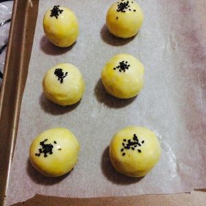 放入烤盘,刷一层蛋黄液,撒些黑芝麻点缀,烤箱预热十分钟,180度中层烤三十分钟,看各人家烤箱温度,烤箱温度高的话170度到175度烤30分钟。
