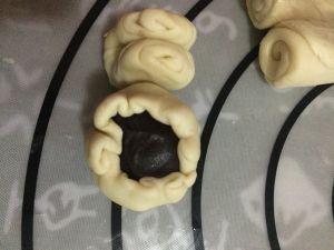 把松弛好的面皮对折朝下擀成中间稍厚四周稍薄的面皮,馅心放入面皮中包汤圆那样包好,收紧口子朝下。