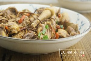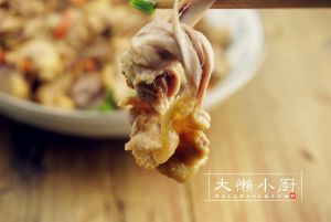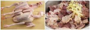 乳鸽买的时候就让卖家帮忙处理一下,回来就把毛清理干净,洗干净;把乳鸽切成小块儿。(头部和爪子我没放进去)