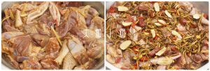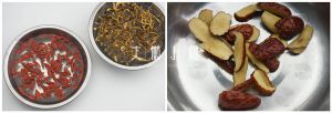 枸杞、虫草花提前浸泡、洗净;红枣去核,切片。