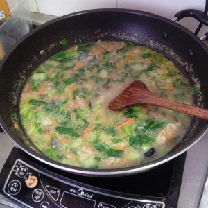 等米煮沸后倒入皮蛋和青菜煮1分钟,加入调味品,再剪葱下去搅拌一下。一道美味的海鲜皮蛋瘦肉粥就做好了!开吃!
