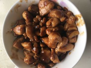 热锅中放油,放入姜片炒出香气,倒入腌制好的鸡腿,翻炒变色就倒入事先调好的照烧调料,翻炒均匀后倒入水淀粉,鸡腿肉均匀地裹上酱汁后就可以盛出备用了