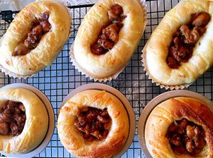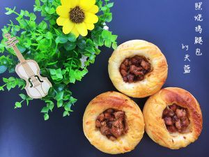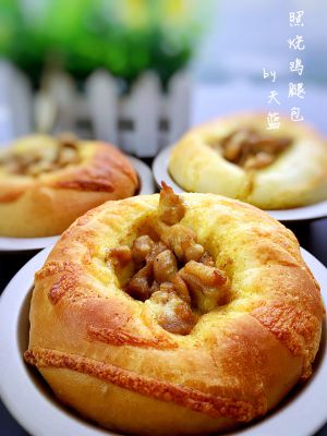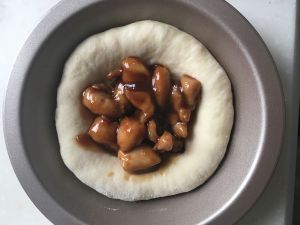 在面团中间凹陷处填入炒好的鸡腿后,将面团置于温暖湿润处开始二次发酵;