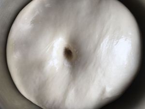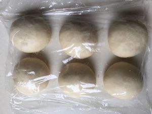 发酵好的面团排气,分割为6份后滚圆,盖保鲜膜松弛20分钟