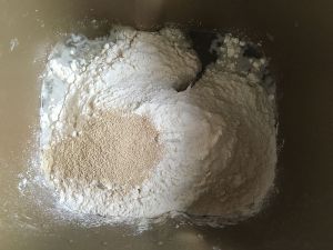 先开始制作面包坯。除黄油外的所有材料放入面包机,揉面约15分钟后加入黄油,揉到扩展阶段