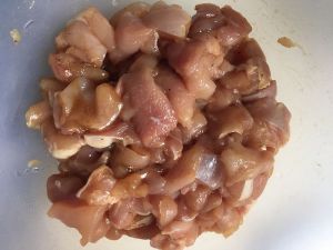 面团发酵的时候处理馅料。先将鸡腿洗净,去皮去骨去筋膜,切成丁后用少许盐和胡椒粉腌制30分钟左右;料酒、生抽、蜂蜜混合成照烧调料;马苏里拉芝士擦丝