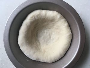 将面团按扁后稍微擀开成圆形,放入模具中,再像做蛋挞那样用双手的大拇指将模具底部的面团压薄