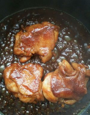 这次用少一点老抽,加白糖三勺,料酒适量,盐少许,用清水搅拌均匀后加入锅里,闷几分钟。