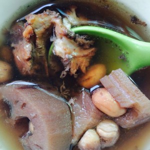 冰箱拿出的排骨要解冻 下锅焯熟 去血水。莲藕去皮切块,花生洗洗备用。