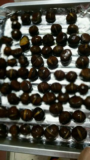 把煮好的板栗放入烤盘!烤盘提前铺好锡纸,并倒入一点食用油。把板栗均匀沾上食用油后放入烤箱!