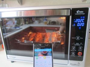手机连接烤箱,通过手机控制设定上下烤, 200度, 20分钟;