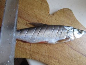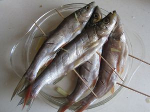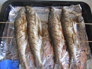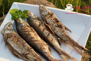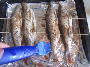 再在鱼的表面撒上辣椒粉和孜然粉;