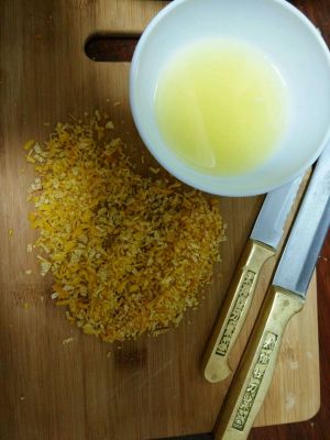 柠檬取汁后,留柠檬皮,将柠檬皮白色的内层尽量刮掉后切碎。