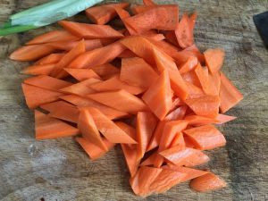 腌鸡翅中的期间,可以把胡萝卜切成菱形,蒜用刀拍扁