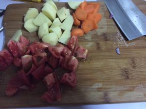 胡萝卜土豆切楔形块,洋葱切小方块,西红柿切块