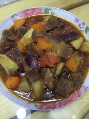 热锅凉油,依次放入洋葱、胡萝卜、土豆煸炒,加两碗水,放入炖好的牛肉,再倒点肉汤,炖炖炖