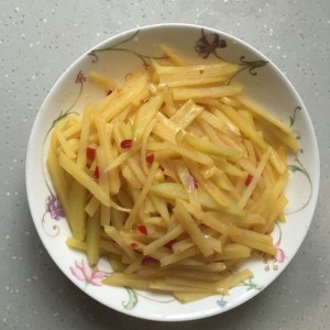 起油锅,舀适量剁椒酱煸香,倒入土豆丝。