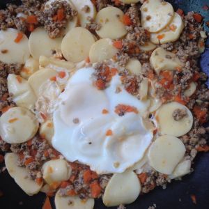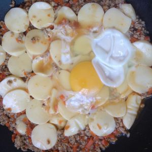 焖了几分钟后打一颗鸡蛋进去、继续盖上锅盖焖、