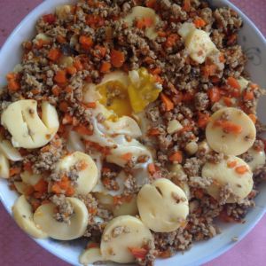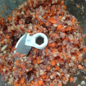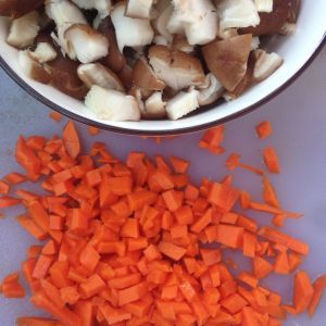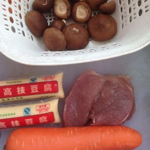 香菇、胡萝卜、猪肉全部切碎、生姜也切碎、