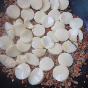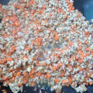锅里放油爆香蒜末、再把混合好的肉糜倒进去翻炒均匀、小火慢炒、要放适量盐、香菇会出水,炒的半干时候加点水、加入水和食材齐平的样子就好了!再继续小火煮.