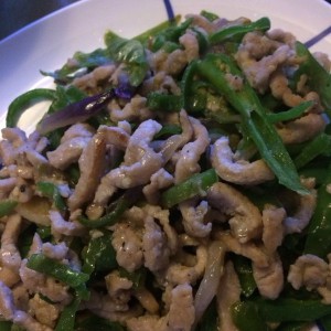 青椒、二荆条切丝,洋葱切丝,蒜切片。下油,油热后下蒜、洋葱、二荆条爆香。腌好的肉丝去掉姜片下锅翻炒,肉丝略微变色后下大青椒丝。炒到熟透出锅。