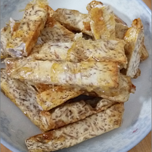 香芋切块后放油炸至金黄色捞出,锅洗净,不能有一滴油。放入砂糖小火炒至融化倒入炸好的芋头