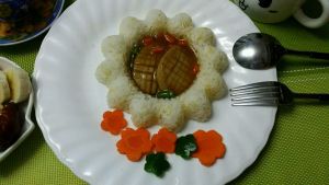 将煎好的的杏鲍菇放到米饭中或旁边,浇汁。看,想不想鲍鱼呢。